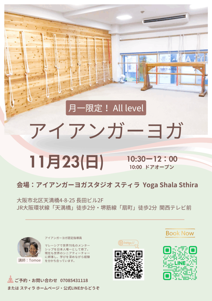 月に一度だけの大阪での対面レッスンで、アイアンガーヨガの深みをぜひ体感してください。
